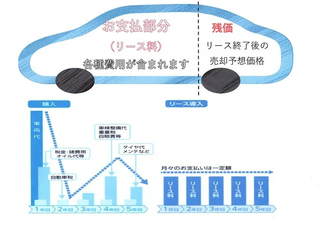 車両代金・登録諸費用・税金・自賠責保険料等がパッケージされてますので、購入やローンと違い、諸費用などの資金の準備が不要です。
