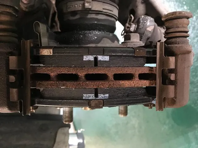 金属製のパット残量センサーがディスクローターに干渉し、異音が発生していました。