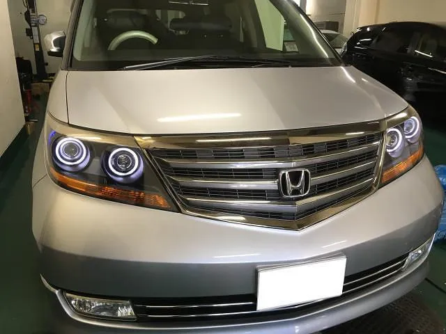 ホンダ エリシオンプレステージのヘッドライトをダブルキセノン・イカリングヘッドライトに交換の作業をさせていただきました。