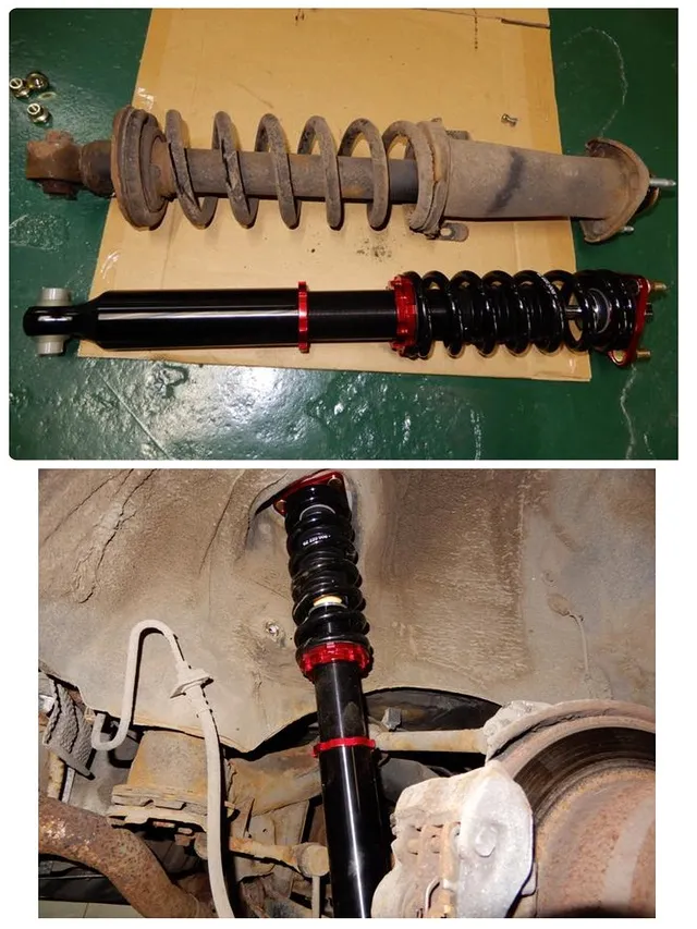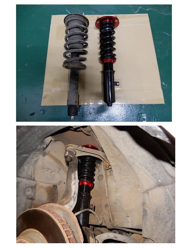 右下写真はリヤ車高調取付後