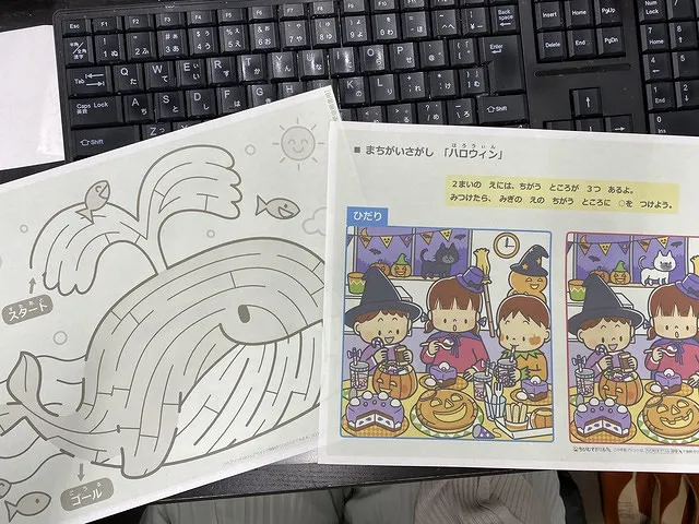 もうちょっと大きい子には間違い探しや、迷路を渡して考えながら遊んでもらってる。